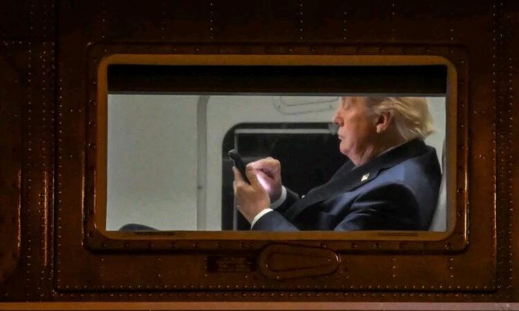 A photo shows President Trump using his cellphone aboard Marine One as he leaves an event in Virginia and heads back to the White House after attending a dinner hosted by his own political group.